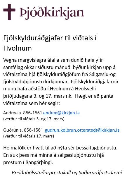 Vegna margvíslegra áfalla sem dunið hafa yfir samfélag okkar síðustu mánuði býður kirkjan upp á viðtalstíma hjá fjölskylduráðgjöfum frá Sálgæslu-og fjölskylduþjónustu kirkjunnar. Fjölskylduráðgjafarnir munu hafa aðstöðu í Hvolnum á Hvolsvelli þriðjudagana 3. og 17. mars nk. Hægt er að panta viðtalstíma sem hér segir: